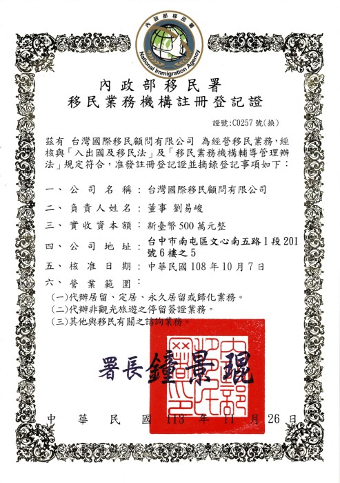 公司小故事 以『台灣』命名,讓每個移民來台的都熱愛台灣這塊土地,我們是台灣本地經營的移民顧問公司,獲得內政部移民署特許(註冊登記證第C0257),有合法移民顧問牌照,可經營台灣移民業務。我們熟悉移民法規和流程,協助每位移民來台來台適應台灣生活,更提供一條龍專業移民服務。